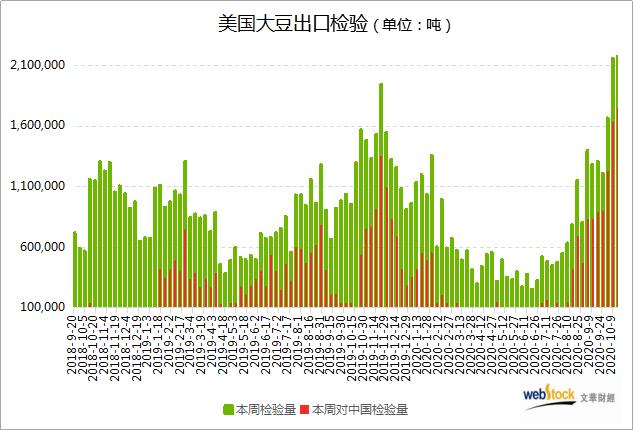 USDA最新报告显示,截至10月15日当周,美国大豆(4870,-15.00,-0.31%)出口检验量进一步攀升至2,173,521吨,位于市场预估区间的高端,创下近3年高位。当周,对中国大陆的大豆出口检验量为1,743,108吨,连续第7周增加,占出口检验总量的80.2%。