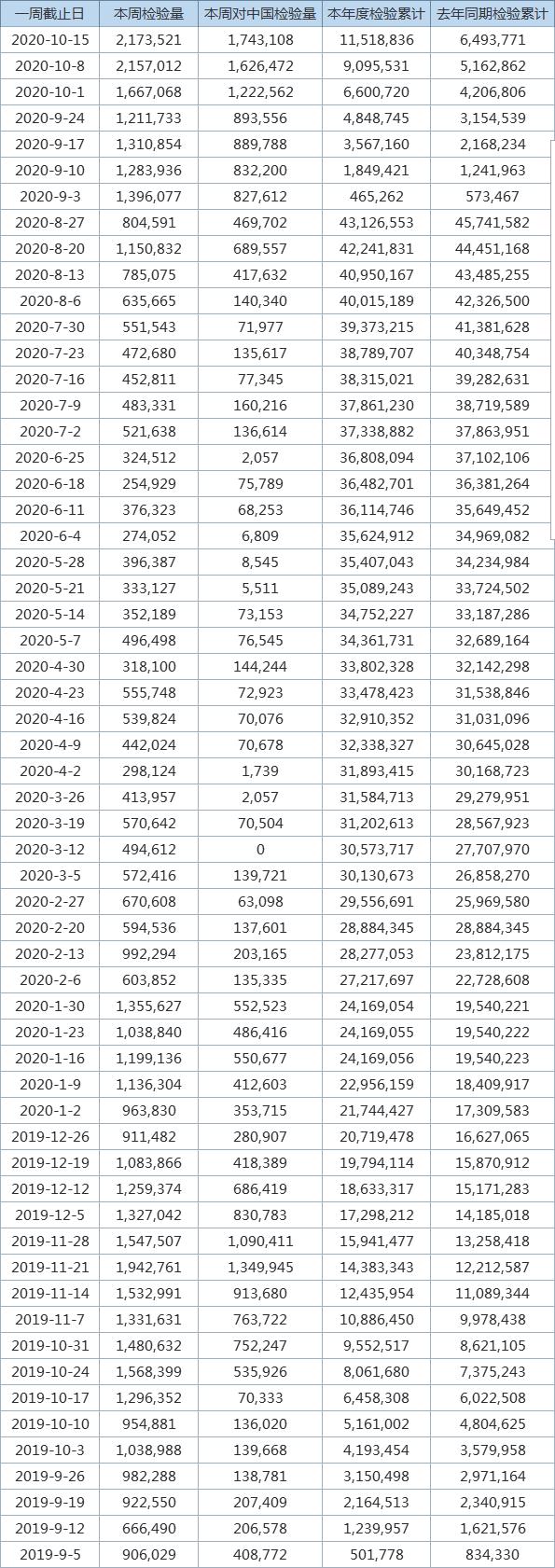 以下为2019/20年度以来USDA每周出口检验大豆数据一览表:(单位:吨)