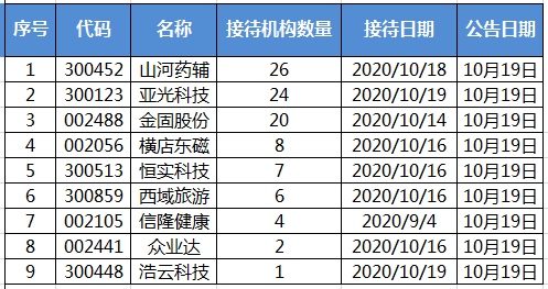统计数据显示,10月19日,被机构调研的上市公司数量共9家,其中山河药辅最受关注,获26家机构投资者来访调研;亚光科技(14.460,-1.12,-7.19%)接待24家机构调研。