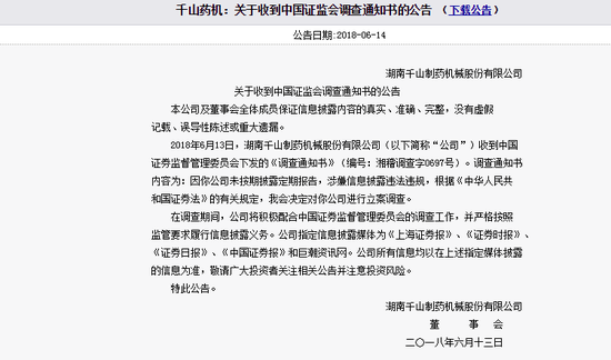 资金短缺、诉讼缠身,“迟到”的年报还被出具非标!本周连续3个跌停之后,千山药机(6.090,-0.68,-10.04%)6月13日晚发布公告,公司当日收到证监会下发的《调查通知书》,因公司未按期披露定期报告,涉嫌信息披露违法违规,证监会决定对公司进行立案调查。